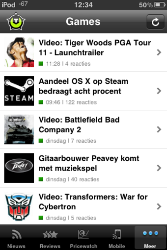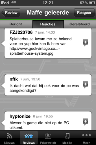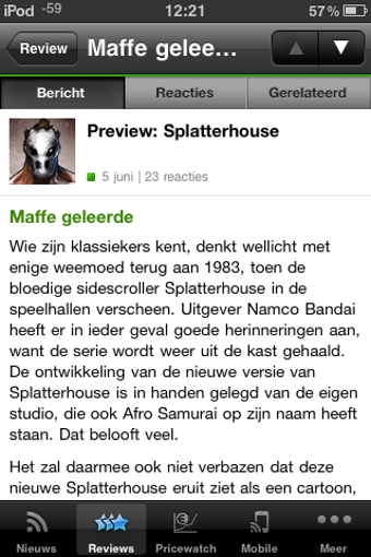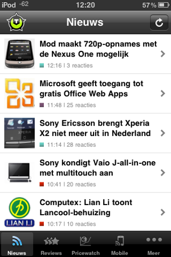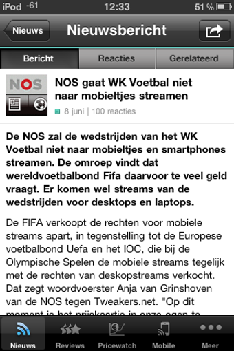 De artikelen van Tweakers.net zijn ingedeeld in vijf categorieën, die huizen achter knopjes onderin het scherm. Van links naar rechts zien we Nieuws, Reviews, Pricewatch, Mobile en Meer. De laatste categorie had ook gewoon 'Games' mogen heten, deze sectie bevat namelijk het Game-nieuws. Elk artikel bevat drie tabbladen, te weten Bericht, Reacties en Gerelateerd. Zelf reageren kan ook, je moet hiervoor wel inloggen op Tweakers.net. Naast reageren deel je recensies ook gemakkelijk via e-mail of Twitter.